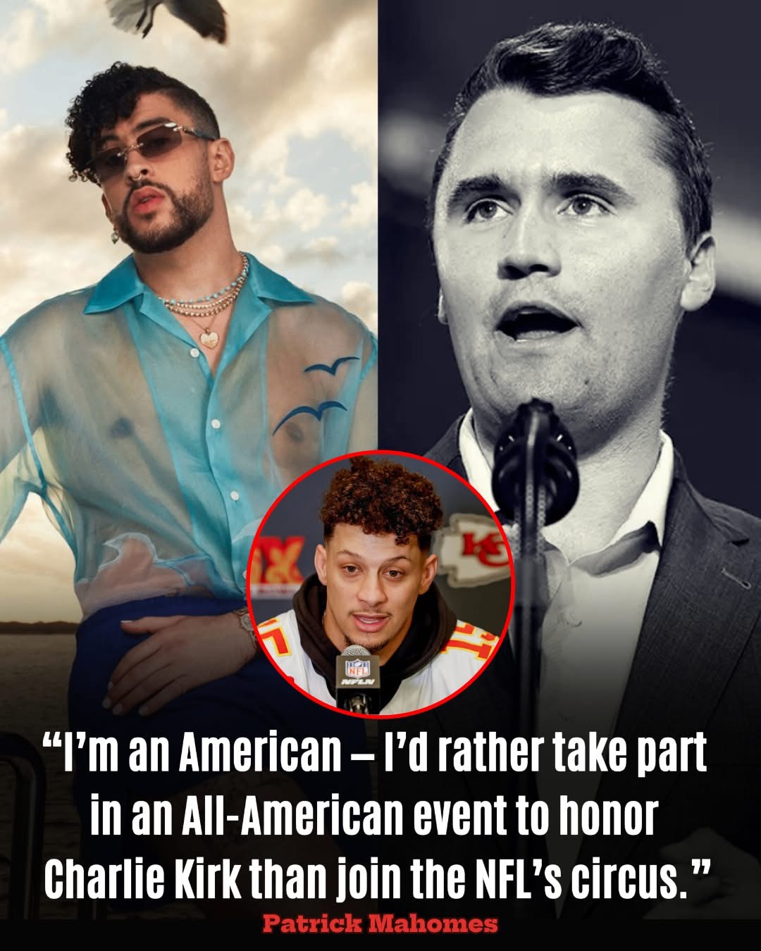 BREAKING: Patrick Mahomes caused a stir after declaring he would boycott the Super Bowl if organizers still let Bad Bunny perform at the halftime show. He said he would instead join Turning Point USA to honor Charlie Kirk, adding a pointed remark: “I’m an American — I’d rather be part of something All-American than the NFL’s circus.” His statement has sparked a wave of controversy, with fans flooding social media with mixed reactions. Full story in comment 👇👇